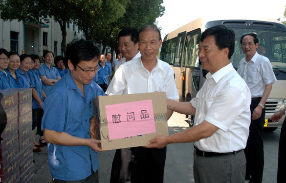 7月24日,溧阳市委书记盛建良、市政协主席狄立新、市委常委、常务副市长周卫中、副市长蔡金龙等领导来东升pg娱乐游戏,亲切慰问冒着高温酷暑坚守在生产一线的企业员工,并送来慰问品。集团董事长、总经理丁山华及部分一线员工对市领导的到来表示热烈欢迎。
