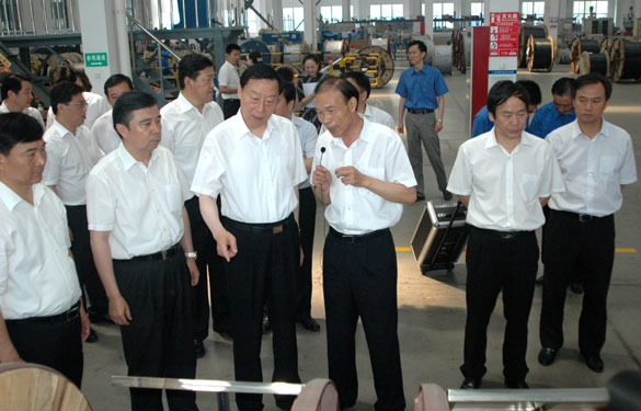 在三厂区四基地示意图前,丁山华董事长就企业“十二五”以来转型升级情况向罗书记作了汇报,丁董事长表示,近年来企业大力实施“精、专、特、外”发展战略,不断加大科技创新、品牌建设和产品开发力度,去年实现销售近120亿元,综合竞争力居国内行业前列。经过“十一五”期间大的技改投入,上上在附加值高的特种电缆领域形成了独特优势,尤其是核电缆国内市场占有率达70%以上,成为第一供应商,已服务于世界第一座三代安全型核电站。“十二五”期间,企业坚持强身长寿练内功,建设高端制造产业基地,大力研发高端材料,高端产品,开发高端市场,谋求健康发展、长效发展,为更好地实现“企业强,职工富”、“行业状元,百年老店”的目标而努力。