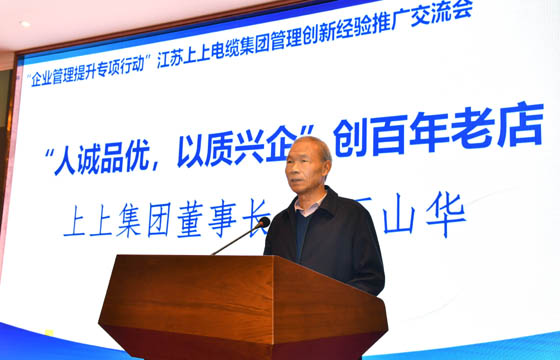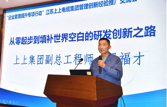 交流会上,上上电缆董事长丁山华围绕“专注、专业、人诚、品优、创新”等五个方面分享了上上跨越半个世纪的发展实践与探索经验。副总经理朱洪祥、副总工程师、核电办主任梁福才、低压分厂厂长葛秋平分别从质量管理绩效模式、研发管理创新、高效率运营管理之道三个维度作了专题报告,对上上管理创新经验作了详尽分享。两位特邀专家围绕工业互联与标识体系、合规管理体系的建设与提升主题作了精彩演讲。